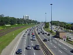 Vista de la Macdonald-Cartier Freeway y del cruce en trébol que forma con la Leslie Street.