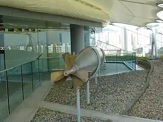 Réplica de un torpedo Brennan en el Museo de Defensa Costera de Hong Kong; la sección muestra los dos carretes de alambre utilizados para la propulsión y el guiado. | ||