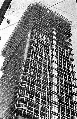 Se trata de una estructura de hormigón armado: tres pórticos conformados por hileras de cinco columnas cada uno, y es un caso en donde el núcleo de circulaciones verticales no tiene función estructural. Los pórticos descansan sobre tres bases de 1,80 metros de altura. El sector de la subgerencia del banco (2° piso) y de la gerencia (3° piso) se encuentran sobre la esquina de Sarmiento y San Martín, en un volumen diferenciado desde el exterior, ya que el hall de acceso a las oficinas de la torre posee múltiple altura, jerarquizando estas oficinas de altos cargos a diferenciarlas visualmente del resto del basamento, ya que se perciben como un voladizo suspendido sobre la entrada al banco.
