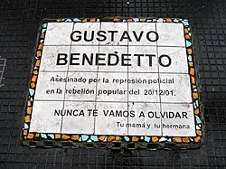El 20 de diciembre de 2001 fue asesinado frente a la Torre HSBC el joven Gustavo Benedetto de 23 años,[3] que se dirigía en una marcha hacia la Plaza de Mayo en el marco del estallido social del final del Gobierno de Fernando de la Rúa. La bala que lo mató fue disparada desde el interior del edificio,[4] desde donde tanto personal de seguridad como civiles dispararon más de 40 balas ese día.[5] El hecho quedó registrado por las cámaras de seguridad del banco HSBC, aunque no se pudo identificar al autor material del crimen porque el proyectil salió del cuerpo de Benedetto.