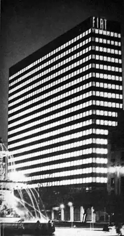 Hacia el año 1954 la empresa Fiat Concord, filial argentina de la firma italiana, planeó la construcción de un edificio para sus oficinas en el centro de Buenos Aires.[1] Al año siguiente adquirió un terreno sobre la calle Cerrito en la esquina con Viamonte, buscando una ubicación estratégica y simbólica, frente a la Avenida 9 de Julio y junto al Teatro Colón.[1] En 1957, cuando la Municipalidad de Buenos Aires permitió la construcción de edificios en torre, el proyecto fue ampliado[1] y el nuevo diseño por concurso fue ganado por los arquitectos Rafael Amaya, Miguel Devoto, Alberto Lanusse, Eduardo Martín y Augusto Pieres, socios en uno de los grandes estudios que iniciaron la arquitectura moderna para oficinas en la Argentina.[2]