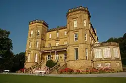 Es un edificio de sillería de cuatro plantas, con cuerpo central y dos torres laterales de forma hexagonal que presenta línea superior almenada. El acceso principal se realiza por escalinata doble que accede desde el jardín al porche sobre el que se encuentra la terraza que une las dos torres.