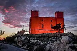 Con respecto a la Torre Roja o Torre de Santa Águeda, una vez completada su construcción, fue equipada con un cañón en 1649. Esta torre de vigilancia fortificada está situada en las imponentes alturas del risco de Marfa, sobre la bahía de Ghadira y tiene vistas a la isla de Comino, y al canal de Gozo, al noroeste. Con su cañón podía cubrir la bahía arenosa que tiene debajo, así como parte del canal para lo que contaba con el apoyo de la torre de Comino. En el momento de su construcción era el puesto más alejado de la ciudad de La Valeta, y por tanto servía también como puesto de comunicación con la isla hermana de Gozo mediante la Torre de Santa María de Comino.