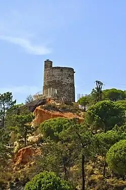 Tiene forma troncocónica, presentando aparejo de mampuestos mal careados.[7] Tiene un escalón a media altura, que divide las dos fases de su construcción. La primera fase es maciza de piedra y la segunda de piedra y ladrillo.[8]