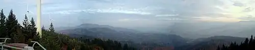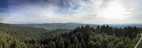 Vista panorámica desde la plataforma de la torre de observación hacia el oeste, en el fondo, en la bruma, la ciudad de Friburgo