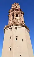 Sobre la plataforma aterrada de la antigua Torre de la Alcudia se construyó el siguiente cuerpo de la torre, la que sería Torre Campanario, que pese a ser también de planta octogonal, esta es decreciente, dando lugar a zonas aterrazadas con antepecho, que presenta un remate en los ángulos con bolas de piedra. Pueden distinguirse en ella dos cuerpos principales y la cúpula, que, a su vez, está rematada con linterna con luz propia.[1]​ Este segundo cuerpo es el que contiene las campanas, las cuales se ubican en unas aberturas en arcos de medio punto. A su vez, el cuerpo está subdivido en dos, de manera que en la parte inferior se encuentra el mecanismo de un antiguo reloj que, exteriormente, presenta decoración con dibujos geométricos en rombos. Por su parte, la linterna superior está menos decorada que la parte central y tiene como remate un cupullín que se cubre de teja árabe vidrada.[1][2]​ Destaca la decoración externa mudéjar de este cuerpo, realizada en ladrillo visto, perteneciente a la época de desarrollo del arte mudéjar-plateresco, con una clara ascendencia aragonesa. También llevan decoración de ladrillo las pilastras que corresponden a los ángulos y que tienen cierto carácter de estribos. Se observa finalmente otro antepecho con arquillos con ajimez y remates de bolas de piedra en los pilares, que da paso al cuerpo superior, que es la gran linterna, de arcos de medio punto rematada con cúpula semiesférica cubierta con teja vidriada verde y linterna con luz propia todo ello fechado en el siglo XVII.[1][3][4]