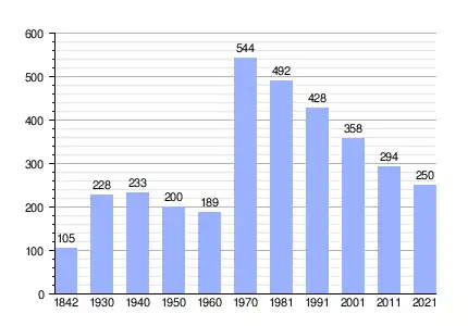 | Gráfica de evolución demográfica de Torres de Barbués[7] entre 1842 y 2021 |