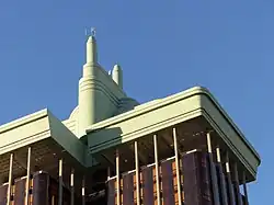 El edificio consta de una base o podio sobre la que se alzan dos torres gemelas de color marrón anaranjado rematadas por dos copetes verdosos unidos por un remate con forma de enchufe del que cuelgan las escaleras de emergencia. El edificio tiene tres ascensores en cada torre y dos ascensores en las plantas de aparcamiento.[20]
