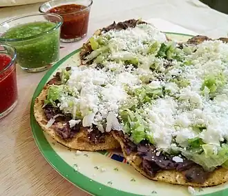 La base es la tortilla, son hechas en base de frijoles refritos untados por la tortilla, con lo cual se acompañan otros diversos ingredientes para acompañar.