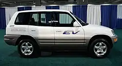 El RAV4 EV se parecía mucho a la versión con motor de combustión interna (ICE), sin tubo de escape, y tenía una velocidad máxima limitada a 78 mph (126 km/h) con una autonomía EPA de 95 mi (153 km) .[22] El paquete de baterías NiMH de 95 amperios por hora tenía una capacidad de 27 kWh, se carga por inducción y demostró ser muy duradero. Algunos RAV4 EV recorrieron más de 150 000 millas (241 401 km) utilizando la batería original. También fue uno de los pocos vehículos con una caja de cambios de una sola velocidad cuando se introdujo en el mercado.