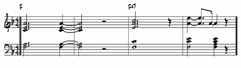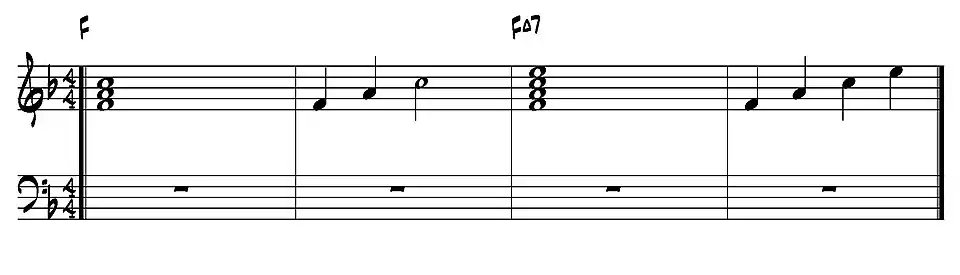 - Acordes de F (tríada) y FMaj7 (cuatríada) ejecutados en forma armónica (compases 1 y 3) y arpegiados (compases 2 y 4). Nótese el sonido más rico y lleno de FMaj7 respecto a F: