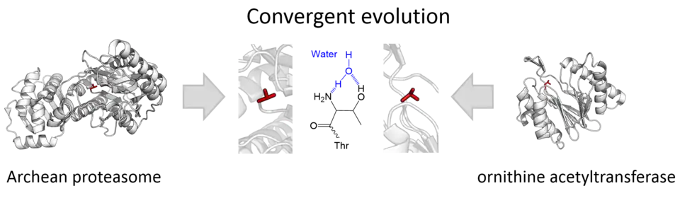 Varias superfamilias de enzimas evolutivamente independientes con diferentes plegamientos proteicos, hacen uso del residuo treonina N-terminal como nucleófilo. Primeramente aparece en la Superfamilia PB (proteasomas que hacen uso del plegamiento Ntn)[19] y en segundo lugar en la Superfamilia PE (acetiltransferasas que utilizan el plegamiento DOM)[20] Esta concordancia en los sitios activos en proteínas con plegamientos completamente diferentes indican que el sitio activo ha evolucionado en forma convergente en diferentes superfamilias.[2][16]