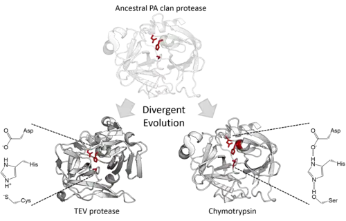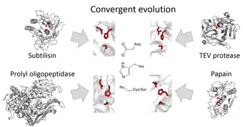 La enzimología de las proteasas provee algunos de los más claros ejemplos de evolución convergente. El mismo arreglo geométrico de los residuos de las tríadas han evolucionado independientemente más de 20 veces (en superfamilias de enzimas separadas) eso es porque existe un número limitado de arreglos productivos de los tres residuos de las tríadas, el esqueleto de la enzima, y el sustrato. Estos ejemplos reflejan las limitaciones intrínsecas en la química de las enzimas, impulsando a la evolución a converger independientemente en las mismas soluciones en forma repetida.[1][2]
