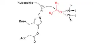 La cadena lateral del residuo nucleofílico lleva a cabo un proceso de catálisis covalente sobre el sustrato. El par solitario de electrones presente en el oxígeno o el azufre del nucleófilo ataca al carbono del grupo carbonilo. Los 20 aminoácidos canónicos no contienen grupos funcionales lo suficientemente nucleofílicos para llevar a cabo muchas reacciones catalíticas particularmente dificultosas. En la naturaleza, los nucleófilos más comúnmente utilizados son el grupo alcohol (OH) de una serina y el grupo tiol/tiolato (SH/S−