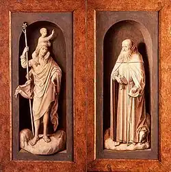 Al cerrarlo, los paneles laterales muestran por el exterior un San Antonio Abad y un San Cristóbal en grisalla, simulando estatuas como entonces era costumbre en los retablos flamencos.