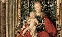 En el panel central, la Virgen y el Niño están sentados en un trono en la nave de una basílica con columnas a ambos lados.[7] Las columnas están pintadas con una variedad de pigmentos rojos oscuros, naranjas y grises, una paleta de color de la cual ha dicho Peter Heath que otorga un "sentido de silencio gaseoso".[19] El trono está colocado sobre un estrado, sobre una alfombra oriental suntuosamente dibujada, que se encuentra en un suelo con diseño geométrico en las baldosas.[7] Los brazos del trono con dosel y los arcos a ambos lados contienen figuras talladas, incluyendo pequeñas representaciones de Isaac, y de David y Goliat.[20] No obstante, la historiadora del arte Antje Maria Neuner interpreta esta talla como una representación de Jefté sacrificando a su hija.[19] María viste una capa bordada y, como es típico en van Eyck, voluminosa y roja, que sirve como baldaquino.[21] La capa está sobre un vestido azul de corte cuadrado, con acabados de joyas.[22] El Niño Cristo está desnudo y muestra al donante una banda[7] adornada con una frase del Evangelio de Mateo (11:29), DISCITE A ME, QUIA MITIS SUM ET HUMILIS CORDE ("Carguen con mi yugo y aprendan de mí, pues yo soy apacible y humilde de corazón, [y encontrarán descanso para su alma]").[4]