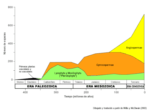 ![]() Registro fósil de aparición de los diferentes clados de plantas vasculares. Nótese la intensa radiación de las angiospermas en comparación con los helechos y gimnospermas. Dibujado y traducido a partir de Willis y McElwain (2002).[5] |