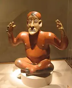 - Las figurillas «chinescas» o «chinescos» fueron nombradas así por los marchantes de arte por su supuesta apariencia china. Un tipo temprano, el chinesco, se identifica con Nayarit[19] y se han identificado hasta cinco subgrupos principales, aunque existe una superposición considerable.[20] Las figuras del tipo A, el llamado «chinesco clásico»,[21] están representadas de forma realista. Un destacado curador, Michael Kan, considera que «su exterior tranquilo y sutil sugiere más que demuestra emociones».[22] Estas figuras de tipo A son tan similares entre sí que se ha sugerido que fueron la producción de una sola «escuela».[23] Las de los tipos B a E son más abstractos y se caracterizan por ojos hinchados y rasgados que se funden con el rostro, y cabezas anchas, rectangulares o triangulares. Estas figuras a menudo se muestran sentadas o reclinadas, con piernas bulbosas acortadas que rápidamente se estrechan hasta convertirse en punta.[24]
