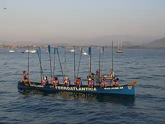 Trainera San José XII de Astillero celebrando una victoria en Santander. Desde los años 90 del siglo XX las embarcaciones y remos de fibra de carbono han sustituido a la madera en la alta competición.[1]