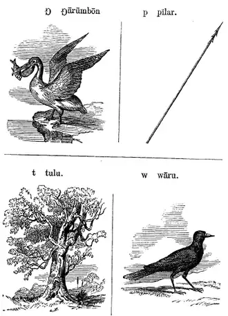 | Gamilaraay | “miel” | wuddul (1903)[4] | warrul (1993)[5] | [waɾul] | Los deletreos originales pueden no distinguir entre [ɾ] y [d], que son alófonos en inglés, pero distintos en las lenguas australianas. |
