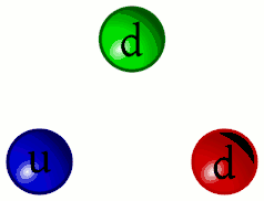 Cromodinámica cuántica como teoría gauge, basada en el grupo SU(3). Cada tipo de quark (u o d en la imagen) posee tres «copias» de distinto «color». Los gluones actúan como bosón intermediario entre partículas con color (como un fotón entre partículas con carga eléctrica).