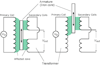A medida que el núcleo se mueve, la inductancia mutua cambia, causando que el voltaje inducido en el secundario cambie. Las bobinas están conectadas en serie pero invertidas, así que el voltaje de salida es la diferencia (por eso es "diferencial") entre los dos voltajes secundarios. Cuando el núcleo está en su posición central, se encuentra equidistante a los dos secundarios, los voltajes inducidos son iguales pero de signo opuesto, así que el voltaje de salida es cero.