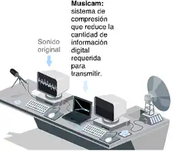 Primero está el sistema de compresión MUSICAM, que después se normalizó denominándose MPEG-1 Audio Capa 2 o MP2, un sistema de codificación que funciona descartando sonidos que no serán percibidos por el oído humano. Cuando hay dos señales muy próximas en frecuencia y una de ellas es más fuerte que la otra, la señal que tiene nivel inferior normalmente queda enmascarada y no es posible oírla. Además, el oído tiene un umbral de ruido por debajo del cual no oye los sonidos. Con este sistema se elimina todo aquello que el oído no va a percibir. De esta forma se consigue disminuir el ancho de banda que se necesita para transmitir. Es un sistema muy parecido al MP3 pero necesita menor capacidad de procesamiento.