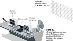 La segunda tecnología es COFDM (Coded Orthogonal Frequency Division Multiplex). Es un múltiplex por división de frecuencias ortogonales en el que realizamos una codificación. Por un lado, la codificación introduce redundancia para poder detectar los errores de transmisión y corregirlos, y, además, el sistema utiliza diversidad en el tiempo, diversidad en el espacio y diversidad en frecuencia. La diversidad en el tiempo se consigue mediante un entrelazado en el tiempo de toda la información, de forma que si hay alguna perturbación, al tener la información distribuida es posible recuperarla mejor. Con la diversidad en frecuencia, utilizando una relación matemática exacta, la señal MUSICAM es dividida entre 1.536 frecuencias portadoras y conseguimos que la información se distribuya de manera discontinua en todo el espectro del canal y se vea menos afectada por las perturbaciones; y con la diversidad en el espacio conseguimos que se pueda enviar desde diferentes centros emisores y que todos ellos contribuyan positivamente creando una red de frecuencia única y, asimismo, que las reflexiones de la señal contribuyan positivamente en el receptor.