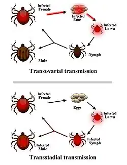Este tipo de transmisión se observa también en otros parásitos tales como los virus o Rickettsia.[3]​ Además de las garrapatas, los ácaros son otro vector común.[3][4]​ Algunas fuentes consideran a la transmisión transestadial un tipo de transmisión horizontal,[5][6]​ mientras que otras fuentes la consideran un tipo de transmisión vertical o parcialmente vertical.[7][8]