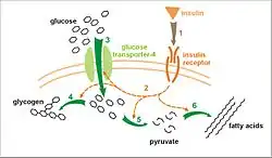 La difusión facilitada de la glucosa a través de la membrana celular es catalizada por transportadores de glucosa GLUT o SLC2 (por sus siglas en inglés: Solute Carrier Family 2) que pertenecen a la superfamilia de transportadores facilitadores y que incluyen aniones inorgánicos y transportadores de cationes, el transportador de hexosas en levaduras, el cotransportador de hexosa/H+ en plantas y el cotransportador bacteriano de azúcar/H+.[3] El transporte de moléculas por parte de estas proteínas transportadores es un ejemplo de difusión facilitada y no requiere del ATP para el mecanismo de su transporte.