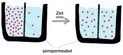 La ósmosis es un tipo de transporte pasivo en el cual solo las moléculas de agua son transportadas a través de la membrana. El movimiento se realiza a favor de la gradiente, esto es desde el medio de mayor concentración de soluto hacia el de menor concentración de soluto, con ello permite equilibrar las concentraciones del soluto de los medios separados por la membrana celular. La función de la ósmosis es mantener hidratada a la célula, dicho proceso no requiere del gasto de energía (ATP).[9]