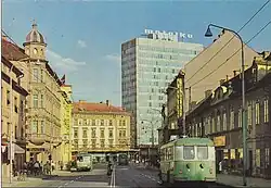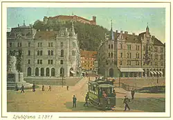 Tranvía en la plaza Marija (actual plaza Prešeren) en 1911
