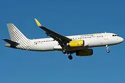 Un avión Airbus A320 de Vueling Airlines aterrizando en el aeropuerto de Bilbao