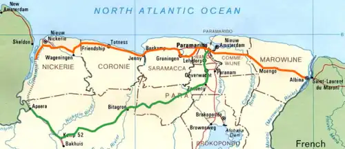 Existe un total de 166 kilómetros de vía única. Son 80 km de vía estándar, 1.435 mm de ancho, en el Enlace Este-Oeste, pero no está en uso. De vía estrecha hay 86 km, 1.000 mm de ancho, va desde Onverdacht a Brownsberg, tampoco está en uso. No hay ninguna conexión ferroviaria con los países limítrofes.