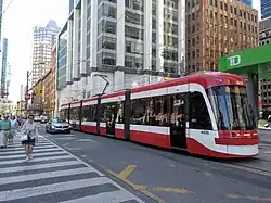 Un tranvía es un sistema de transporte basado en el ferrocarril que circula principal o completamente a lo largo de las calles, con una capacidad relativamente baja y paradas frecuentes; sin embargo, los tranvías modernos tienen una mayor capacidad de pasajeros que los tranvías tradicionales. Los pasajeros suelen subir a nivel de la calle o del bordillo de la acera, aunque los tranvías de piso bajo pueden permitir subir a nivel de la calle. Las líneas de mayor distancia se denominan interurbanas o líneas radiales. Los tranvías modernos también funcionan como trenes autopropulsados acoplados a través de una unidad múltiple en lugar de tranvías individuales y suelen incluirse dentro del término más amplio tren ligero,[1][2] no obstante, se diferencian de estos en que los tranvías comparten con frecuencia la plataforma con el tráfico vehicular y no tienen prioridad semafórica.[3]