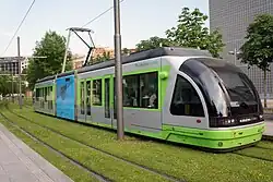 ![]() Unidad del tranvía de Bilbao en la parada de Arriaga | ||