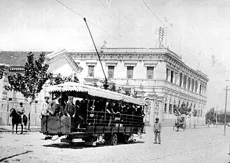 La ciudad de La Plata fue elegida para ensayar el tranvía impulsado por un motor eléctrico. El hecho de que la ciudad contara con un sistema de alumbrado público eléctrico[4] la hacía mucho mejor equipada que Buenos Aires para este experimento. Para ello se tendió un tramo de vías en la avenida 7 entre las calles 45 y 50, con una línea eléctrica aérea. Se realizaron dos ensayos, el primero de ellos el 23 de octubre de 1892, y el segundo el 9 de noviembre de ese mismo año. El temor de los pasajeros a ser electrocutados, sumado al chisporroteo del trole y las ruedas, hizo que la ciudad continuara con el tranvía a caballo hasta 1910.[5]