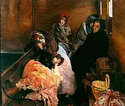 En el cuadro aparecen representadas un grupo de mujeres jóvenes vestidas a modo de campesinas con mantillas y pañuelos en sus cabezas que semejan estar dormitando, a excepción de la anciana de negro que las acompaña, la cual permanece despierta y vigilante. Es la alcahueta (proxeneta). Con el angosto espacio que se refleja en el cuadro, de un compartimento de tren, el pintor trata de simbolizar la imposibilidad de huir del destino. Sin embargo, la alusión a la prostitución se hace de una manera velada, revelándose una gran piedad por parte del autor de cara al tema.[6]