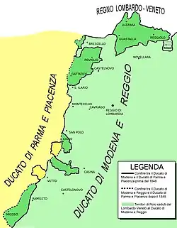 - los territorios del ducado de Guastalla, un exclave del ducado de Parma (que ahora pasará a llamarse oficialmente sólo "de Parma y Plasencia") en las fronteras del de Módena (como compensación por la renuncia a Pietrasanta y Barga);