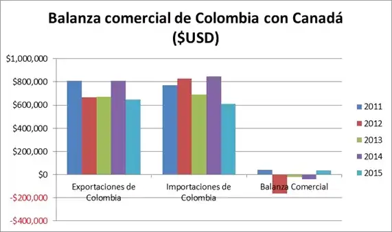 Las exportaciones de Colombia a Canadá se totalizaron en $717 millones de dólares en el año 2010, la mayoría de productos exportados fueron petróleo y combustibles, minerales, café, frutas y azúcar. Las exportaciones de Canadá fueron totalizadas en $644 millones de dólares y la mayoría de los productos importados incluían cereales (trigo y cebada), maquinaria, legumbres (lentejas, arbejas y garbanzos), papel, cartón y vehículos. La inversión acumulada de Canadá en Colombia fue de $824 millones de dólares. Las principales inversiones fueron destinadas al sector petrolero, sector minero al igual que el sector de imprenta.