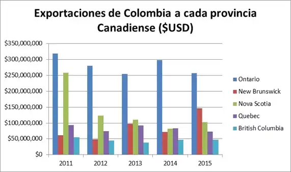 Exportaciones de Colombia a cada provincia Canadiense ($USD)
