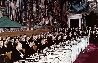 La conferencia dio lugar a la firma, el 25 de marzo de 1957, de los Tratados de Roma, en el Palacio de los Conservadores del Capitolio en Roma. En marzo de 2007, la BBC informó que los retrasos en la impresión del documento, provocaron que el tratado firmado por los líderes europeos consistió en páginas en blanco entre su portada y la página de las firmas.[10]