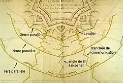 - La 3ª queda en proximidad inmediata a la fortificación. Desde esta se puede intentar un ataque que abra una brecha en las defensas, bien mediante artillería o mediante labores de zapa. Esta debe estar suficientemente bien defendida para evitar una salida desde la fortaleza. A partir del sitio de Luxemburgo de 1684 añadió lo que llamó cavaliers de tranchées, montículos formados por gaviones (fardos cilíndricos de mimbre rellenos de grava y arena que se usaban como defensa). Estos permitían elevar las piezas de artillería por encima del glácis para atacar los muros.