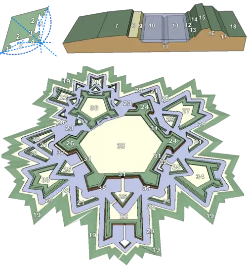 - ↑ Díez Oronoz, Aritz (2020). «La lógica arquitectónica de la fortificación italiana: una aproximación desde la geometría y la forma». Proyecto, Progreso, Arquitectura (22): 118-137. ISSN 2171-6897. doi:10.12795/ppa.2020.i22.07. Consultado el 7 de abril de 2021.