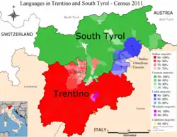 En la provincia autónoma de Bolzano-Bozen, la mayoría habla alemán (69,1% de la población) en su variedad vernácula surtirolesa, aunque en la capital Bolzano-Bozen el 73% de la población habla italiano como su idioma materno debido a la Italianización de Tirol meridional la burocracia y represión del alemán después de la anexión de la región a Italia en el año 1919.[13]​ La minoría de italófonos es significativa, un 26,5% de su población.[14]​ El ladino es el idioma oficial adicional en algunos municipios. Según el censo del año 2001, 103 de 116 comunas tienen una mayoría de hablantes nativos alemanes, 8 de hablantes ladinos y 5 de italiano. Hoy tanto italianos como alemanes tienen el estatus de idiomas cooficiales en la provincia de Bolzano-Bozen.