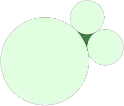 Un triángulo de eje circular tiene todos los ángulos internos iguales a cero.[1] Una forma de formar algunos de estos triángulos es colocar tres círculos, tangentes externamente entre sí en pares; entonces la región triangular central rodeada por estos círculos es un triángulo córneo. Sin embargo, otros triángulos de cuerno, como el arbelos (con tres vértices colineales y tres semicírculos como lados) son interiores a uno de los tres círculos tangentes que lo forman, en lugar de exteriores a los tres.[2]