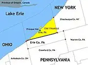 El Triángulo de Erie es una extensión de tierra que abarca cerca de 300 millas cuadradas (780 kilómetros cuadrados) y fue disputado por varias partes durante la época colonial. Finalmente, el gobierno federal de Estados Unidos lo adquirió y lo vendió a Pensilvania, permitiendo que el estado tuviera acceso a un puerto de agua dulce en el lago Erie. Este territorio forma gran parte del actual condado de Erie, en Pensilvania.