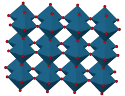 El trióxido de renio cristaliza con una celda unitaria cúbica primitiva, con un parámetro de red de 3,742 Å (374,2 pm). La estructura del ReO3 es similar a la de la perovskita (ABO3), pero sin el gran catión A en el centro de la celda unitaria. Cada centro de renio está rodeado por un octaedro definido por seis centros de oxígeno. Estos octaedros comparten vértices para formar la estructura tridimensional. El número de coordinación del O es 2, ya que cada átomo de oxígeno tiene 2 átomos de Re vecinos.[4]