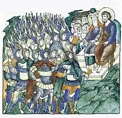 El Militarismo aparece en la historia de Neftalí. En el antiguo Canto de Débora, Neftalí es elogiado, junto con Zabulón, por arriesgar sus vidas en la lucha contra Sísara;[15] en el relato en prosa del acontecimiento,[16] que Arthur Peake considera una narración mucho más tardía basada en el poema,[14][17] se añade que Barac, el líder de las fuerzas anti-Sisera, procede de la tribu de Neftalí.[18] En la narrativa de Gedeón, Neftalí es una de las tribus que se unen en un ataque contra los invasores midianitas, aunque Arthur Peake considera que la narrativa de Gedeón está compuesta por al menos tres textos anteriores, el más antiguo de los cuales describe solo la venganza personal de Gedeón y 300 hombres de su propio clan, no una batalla en la que se le unen el resto de las tribus del norte.[19] En la Bendición de Jacob, que los eruditos textuales datan del 700-600 a. C. -y, por tanto, es una posdicción-, Neftalí es comparado con una gama suelta y elogiado por pronunciar buenas palabras.[20]