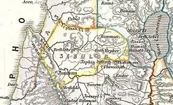 En la división de la tierra de Israel entre las siete tribus aún no previstas, la suerte de Zabulón fue la tercera. El territorio de la tribu comenzaba con Sarid (Josué 19:10), que se supone que era Tel Shadud, [18] a unas cinco millas al suroeste de Nazaret. Los límites de Zabulón no se han determinado. De los diecinueve nombres propios que el libro de Josué nos da para guiarnos, solo Belén de Galilea (Beit lahm, a once kilómetros al noroeste de Nazaret) puede identificarse con certeza, aunque el yacimiento arqueológico de Tel Hanaton está asociado con la ciudad de Hanaton, que figura como límite con Aser. El historiador Josefo asigna a Zabulón la tierra cercana al monte Carmelo y al mar, hasta el lago de Genesaret. [19] Al noroeste se encontraba Aser, al sureste Isacar. Incluía una parte del Valle de Jezreel, y la gran carretera desde el mar hasta el lago. Según el cristianismo, en el territorio de Zabulón se crio Jesús, y dijo e hizo mucho de lo que se narra en los Evangelios, especialmente en los Evangelios sinópticos, sobre su ministerio galileo.
